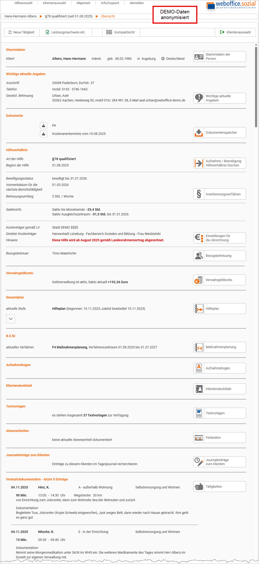 weboffice.sozial mit einem eigenen Modul an zentraler Stelle verankert. Dort lassen sich klientenbezogene