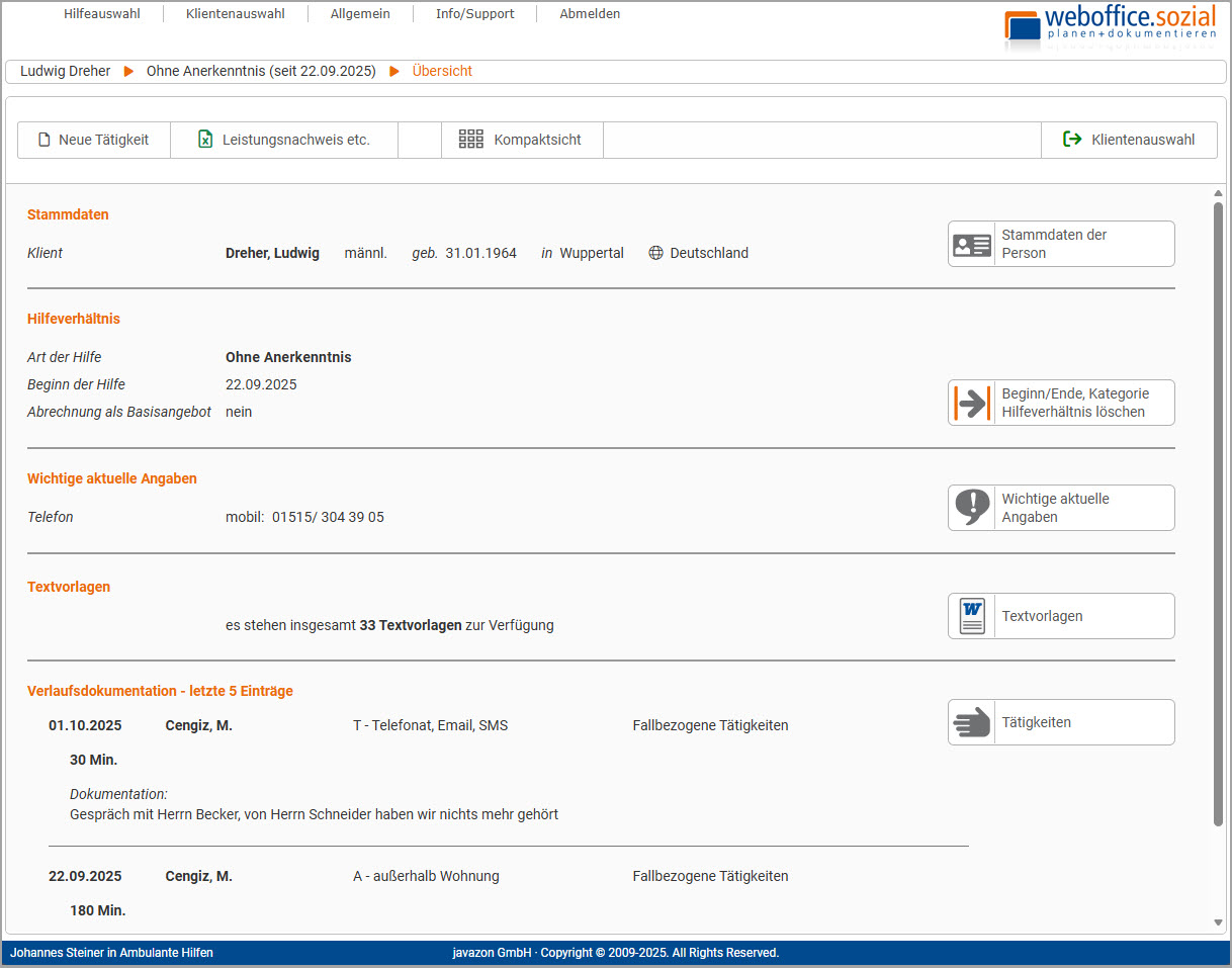 Nach dem weboffice.sozial Login wählt der Anwender einen Klienten aus und gelangt damit direkt zum Dialog Übersicht der Klientendokumentation - hier ein Beispiel: